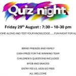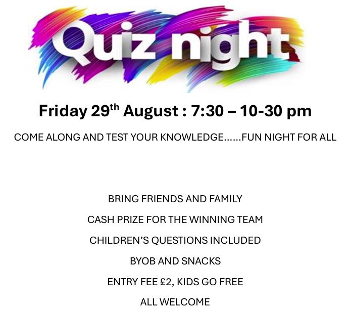 Quiz Night on Friday 29th August at 7.30 in the Church Hall. Admission will be £2.00 for adults, payable on the night and there will be no charge for children. Please bring your own drinks and snacks. We are looking for gifts which could be used for raffle prizes.